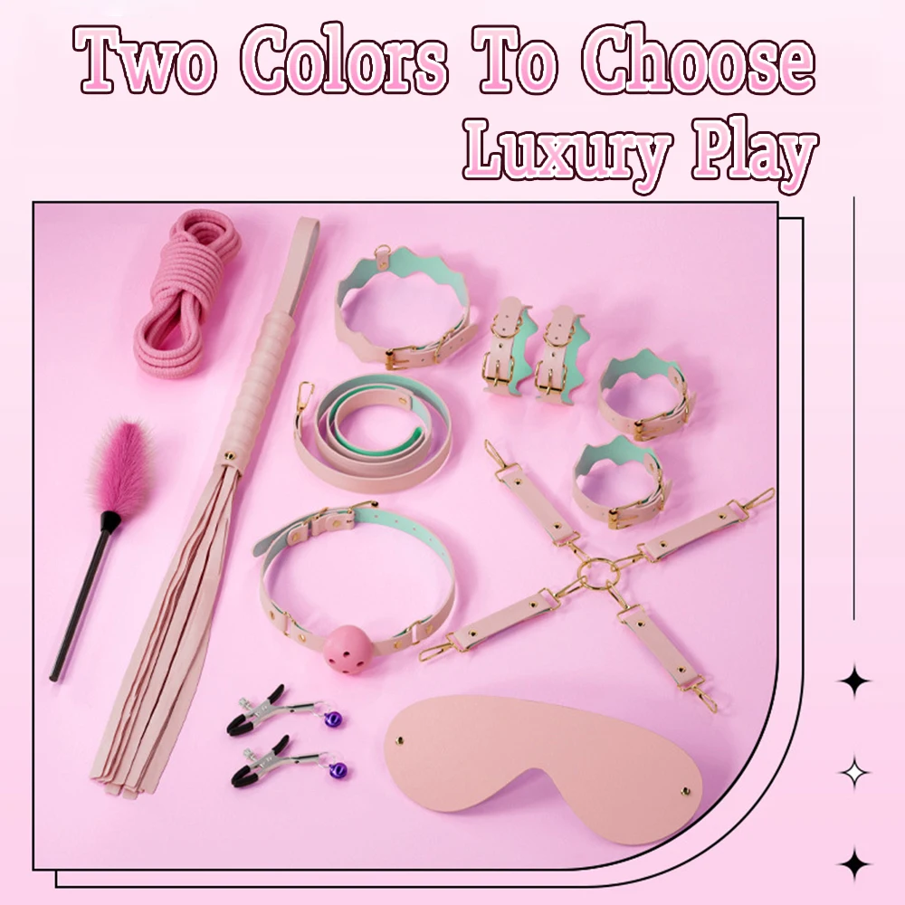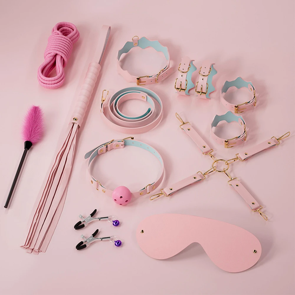 11 piece set - handcuffs, ankle cuffs, drawstring, collar, eye mask, mouth ball, leather whip, cotton rope, breast clip, feather stick, cross buckle