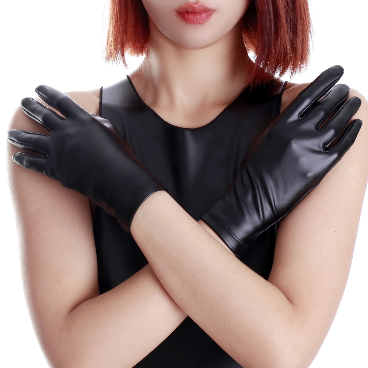 Ftshist PU Leather Gloves Wrist Length Full Finger Wetlook Matte Black Elastic Glove For Women Latex Fetish Costumes Accessories