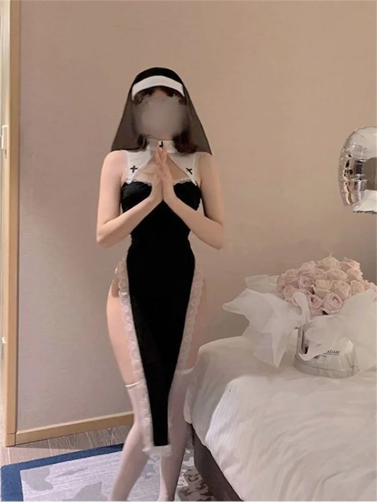 Hot Cosplay Nun Sister Costumes For Women Sleeveless Crotchless Dress Cos Maid Uniform Nightgowns Girl Role Play Erotic Costume